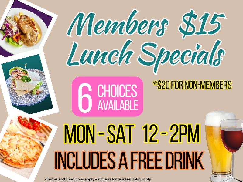 Ladies and Gentlemen, ready to elevate your lunch experience? Introducing $15 Members Lunches! Every day, enjoy a selection of six delectable options from noon to 2 pm, Monday through Saturday. Plus, every scrumptious meal is just $15 for Members and includes a choice of a crisp CUB Beer, 150ml of fine Rothbury Wine, a refreshing Soft Drink, a comforting cup of Tea, or a hot Coffee. So, why wait? Bring your friends or co-workers and make every lunch unforgettable. With a variety of choices, boredom is off the menu. Prepare your taste buds—$15 Lunches is here!