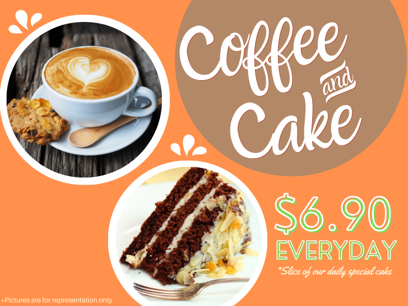 Come and treat yourself to a new taste sensation every day at our café! For just $6.90, you’ll get a piping hot coffee and a slice of our daily special cake. Our menu offers a rotating selection of freshly baked cakes, so you can try something new every time you visit. Today it might be a classic carrot cake, tomorrow a decadent red velvet, and the day after, a zesty lemon drizzle. You never know what delicious surprise awaits you! And, of course, our coffee is always made with the finest beans and expertly brewed for your enjoyment. So, come and see what cake of the day awaits you at our café!