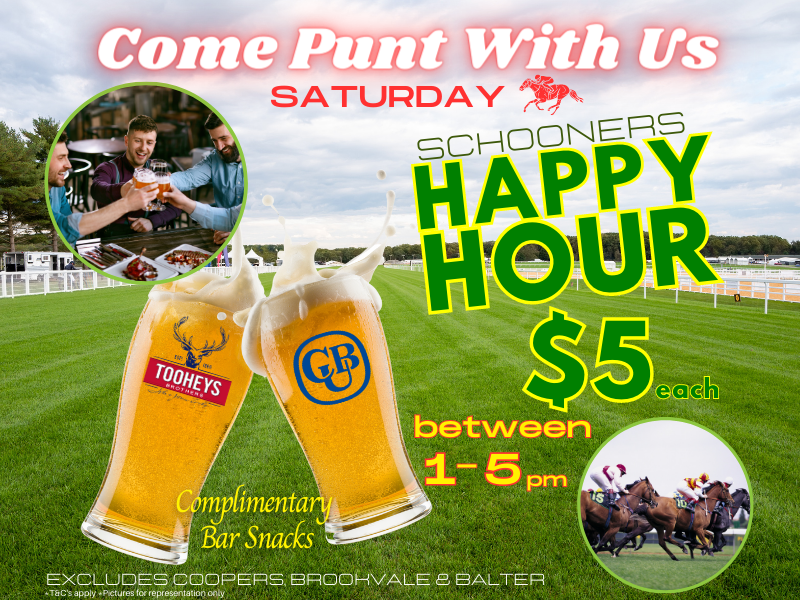 ๐๐ดAttention, fellow punt enthusiasts! Join us on Saturday for some exciting punt action at Come Punt With Us! ๐๐ด But wait, there’s more! ๐ Schooners Happy Hour is here, offering ice-cold drinks for just $5 between 1-5pm! ๐ปAnd as if that wasn’t enough, we’ve got complimentary bar snacks to keep your taste buds satisfied throughout the races!